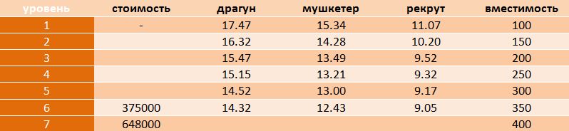 мельница 4 уровень мука - 3:50, сахар 3:50 поварня 4 уровень хлеб - 3:50, ром - 5:45, еда - 5:45 гончарный цех 3 уровень кирпич - 3:58, фарфор - 3:58 оружейня 3 уровень мушкет - 11:52, порох 9:53 кузнгица 3 уровень инструмент - 9:52, кираса - 9:52 склад 8 уровень - 343000 монет |
