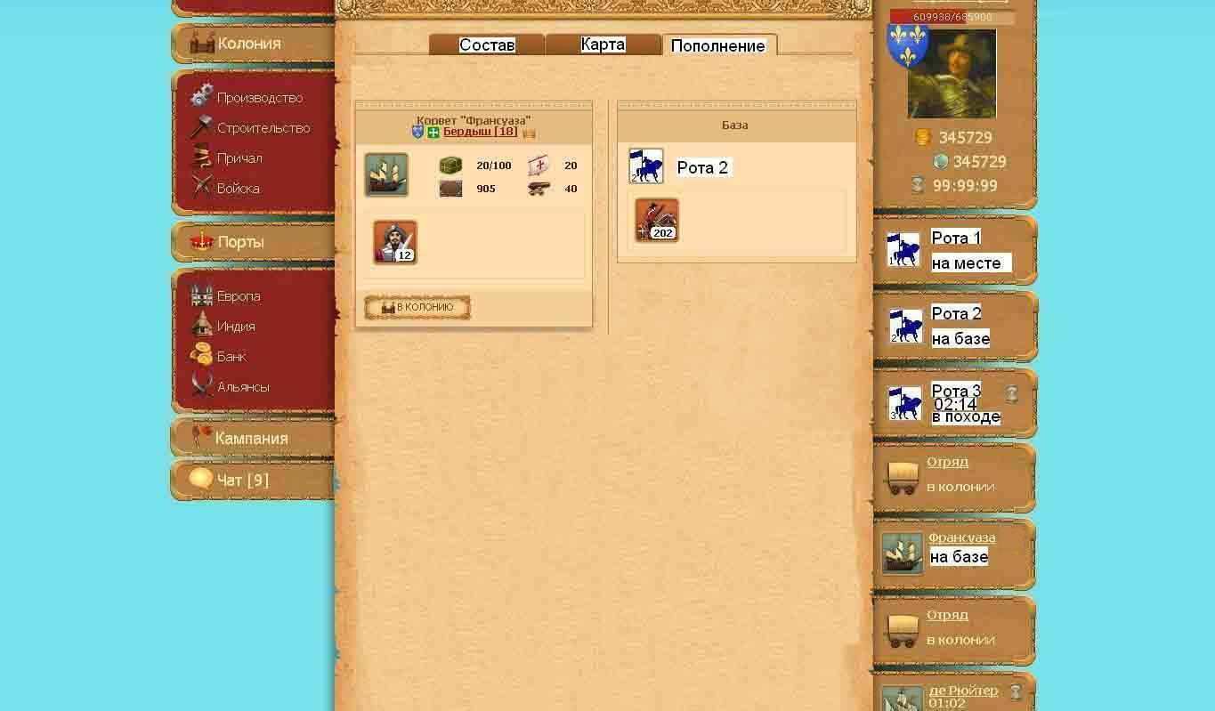 Королевские войны. Вводная. Европейские короли постоянно воюют друг с другом. Делёж династического наследства, религия, оскорбление чести – любой повод используется для организации очередной драчки на крохотном кусочке суши, которую называют Европой. Те далекие события за океаном регулярно докатываются и до наших берегов. Только сейчас прибыл курьер от Его Величества с приказом направить все силы и средства на войну с очередным выскочкой. В награду за победу Король обещает славу, деньги, титулы. К оружию же! Основные правила. Раз в неделю объявляется война между двумя случайными нациями. На протяжении всей недели (назовем этот период кампанией) выбранные нации воюют друг с другом, набирая очки. В конце кампании очки подсчитываются. Каждый участник кампании выигравшей нации получает награду. Каждый участник проигравшей нации получает поощрение. Классификация войсковых подразделений (подробное описание далее по тексту): Войско нации – все игроки воюющей нации со своими войсками Армия – игроки нации, воюющие на одной карте Полк – войска одного игрока Рота – Составная часть полка. В полку 3 самостоятельные роты. Вся кампания делится на несколько этапов: подача заявки на участие (1 сутки), активные боевые действия (5 суток), подведение итогов и перемирие (1 сутки). День 1. Кампания начинается в понедельник в 20-00. На главной странице появляется объявление «Государства Суринам и Эквадор в состоянии войны» (позиция 1 на рисунке 1). После этого, для указанных стран становится активна закладка «Кампания» (позиция 2, рисунок 1). Примечание – названия государств приведены условно, для примера. Далее по тексту под «игроком» понимается игрок воюющей нации. Здесь и далее, государство и нация – синонимы. рисунок 1 В течении суток, до 20-00 вторника, игрок может как подать заявку на участие в войне, отозвать её, а также ознакомится со списком участников. Заявка подается во вкладке «Состав» (рисунок 2). Здесь же отражается и полный список игроков уже подавших заявку. Уровень игрока должен быть не менее 10. В 20-00 вторника подача заявок прекращается. Из числа подавших заявки игроков формируются команды (армии). рисунок 2 Распределение происходит следующим образом: - В каждой армии может быть не более 10 игроков. - Армии альянсов и армии нейтралов формируются отдельно. - В армиях альянсов приоритет на включение имеет игрок с наибольшим уровнем. - В армии нейтралов при одинаковом уровне, приоритет на включение в армию имеет игрок, раньше подавший заявку. - Титул в критерий распределения не входит - Количество альянсовых армий воюющих наций равно. Количество нейтральных армий воюющих наций равно. - В войсках наций может быть любое количество армий, при условии соблюдения предыдущих пунктов. - При неравенстве войск наций, «лишние» игроки в войне не участвуют. Таким образом, главный принцип формирования войск наций является максимальное равенство игроков по количеству. Дни со 2 по 6. С 20-00 вторника вкладка «Состав» становится доступна всем нациям. В ней отражается сформированная таблица состава войск воюющих наций с указанием армий (рисунок 3). Начинается этап активных боевых действий. рисунок 3 Все активные боевые действия происходят на карте в соответствующей вкладке «Карта» (рисунок 4). Для каждой армии противников формируется своя карта. На карте игроки управл
